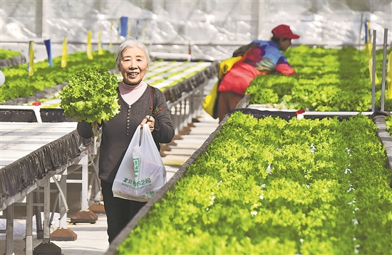 3月18日,市民在朝来农艺园温室内采摘新鲜蔬菜。