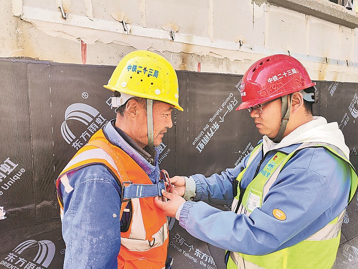 日前,中铁二十三局承建的山东济南书香明月住房项目正在加速推进过程中。为了确保安全生产,项目开展了青年安全生产岗创建活动,组织青年深入现场,着重加强对高空作业、动火作业等特种作业工人进行安全培训,确保施工过程符合安全生产各项标准。图为项目安全员在指导工人正确佩戴五点式安全带。本报通讯员 齐凯 摄