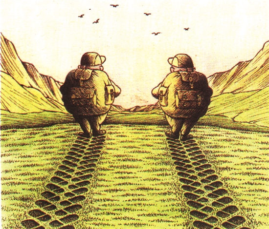 俗话说:道路是走出来的。这两位旅游者不远千里而行,艰辛的步履竟然将山川踏成车辙,可见征程之遥和攀登之乐。