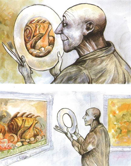 流浪汉的盘子里装满了牛排、烤鸡等美味。噢,拉开距离看,原来盘子是取景框,刚才的一幕是梦中餐而已。