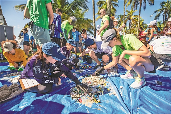 在3月22日世界水日到来之际,巴西里约州多个城市近日开展大规模海滩清洁行动,数百名志愿者共同清理海洋垃圾,旨在推动社会公众对海洋生态保护和可持续发展的关注。图为近日在巴西里约热内卢弗拉门戈海滩,志愿者将收集的垃圾进行分类。新华社记者 王天聪 摄