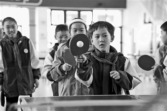 3月21日,在西安市曲江第六小学,学生在体育课上练习乒乓球。