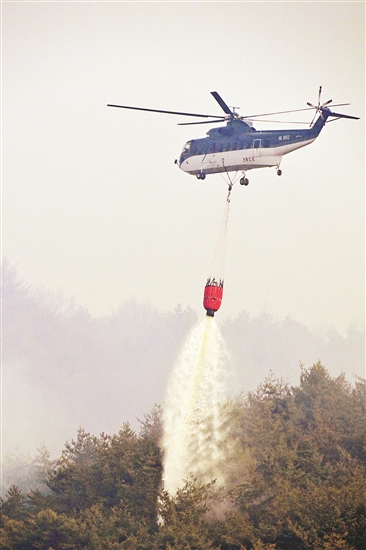 韩国山林厅当地时间3月26日说,22日起于庆尚北道义城郡的山火已蔓延至多地,从25日傍晚至26日晨已造成数十人伤亡。图为当日直升机在韩国庆尚南道河东郡附近灭火。
