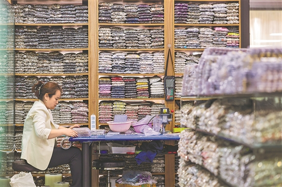 3月27日,在永嘉县桥头商贸中心一家经营钮扣产品的店铺内,员工在打包钮扣产品。