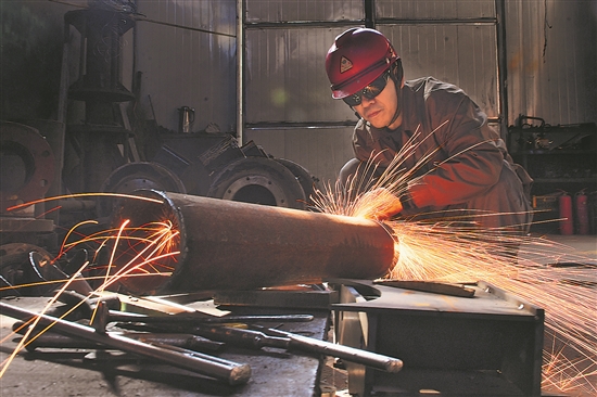 3月29日,工人在山东省青岛市城阳区青岛东林工具有限公司加工车间进行气割冷油器水管。时值一季度末,各地企业一片繁忙景象,工人们加紧生产兑现订单,力争超额完成任务,冲刺“开门红”。