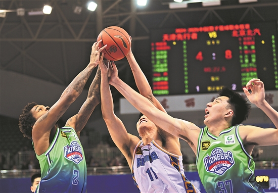 天津队哈姆雷特(左)、杜伯超(右)与北京队范子铭在比赛中争抢篮板球。新华社记者 孙凡越 摄