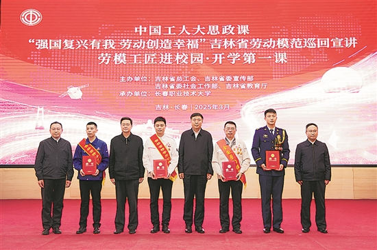 3月27日,“强国复兴有我 劳动创造幸福”吉林省劳动模范巡回宣讲暨劳模工匠进校园·开学第一课首场活动在长春职业技术大学开启。350余名师生代表现场聆听了李万君、杨永修、付春鹏、刘洪宇4位劳模工匠的奋斗故事。李万君寄语:希望同学们在青春的扉页,逐行书写奋斗的诗篇,让人生更加精彩闪耀。(本报记者 彭冰 柳姗姗 本报通讯员 官思妍 史强宇)