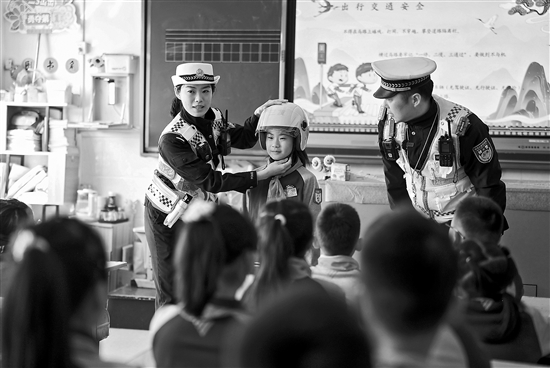 近日,在山东省荣成市府新小学,交警为学生普及安全头盔的佩戴方法。