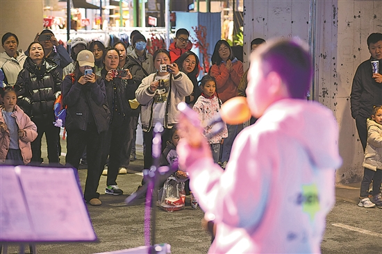 为了给孩子们提供更好的学习、排练场地,在天府今站文化广场的支持下,每周末,“知了小乐团”几乎都在广场周边进行演出,平均一个多星期能有一次商业演出的机会。图为乐团的表演吸引众多市民观看。