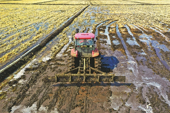 4月7日,在黑龙江北大荒农业股份有限公司友谊分公司第十管理区水稻田中,一台农机在平整土地(无人机照片)。