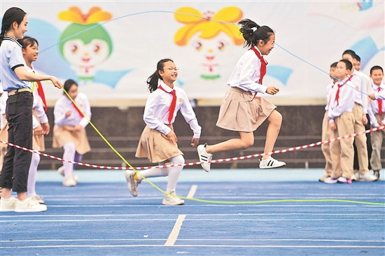 4月10日,学生们在大课间跳绳。春日里,广西柳州市潭中路第二小学总部积极开展丰富多彩的阳光体育大课间活动,让孩子们在紫荆花盛开的校园里,快乐运动,健康成长。新华社记者 黄孝邦 摄