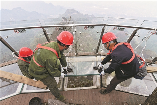 4月8日,施工人员更换玻璃栈道的玻璃。