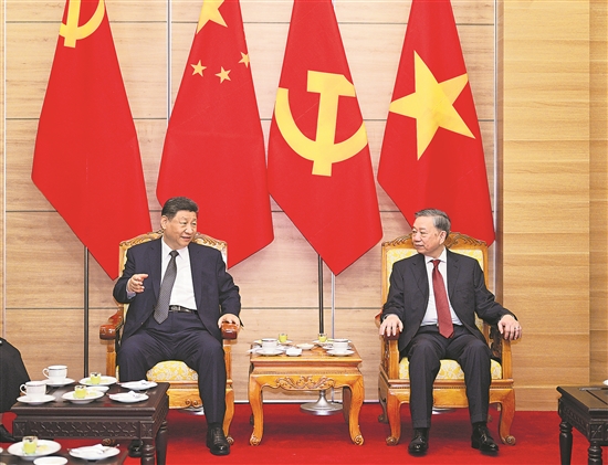 习近平指出,这次访问时间虽短,但活动丰富、成果丰硕。双方重申共同壮大世界社会主义事业的政治意愿,都期待朝着“六个更”总体目标全面推进两国战略合作,都表示抵御外部风险挑战,维护地区和平稳定和国际公平正义。我对中越关系发展前景充满信心。双方要全面落实这次访问成果,持续推进中越命运共同体建设。