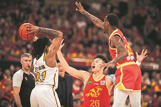 辽宁本钢队球员威尔斯(左前)在比赛中受到浙江方兴渡队球员吴骁(右二)、纳纳利(右一)的包夹防守。新华社记者 江汉 摄