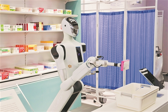 图为在北京“机器人大世界”的应用场景示范区,银河通用机器人进行药店无人值守场景演示。新华社记者 鞠焕宗 摄