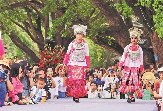 近日,在贵州省黔东南苗族侗族自治州榕江县忠诚镇乐乡村,村民身着民族盛装参加“村T”走秀,通过秀盛装、唱侗歌等活动吸引了众多游客前来感受独特的民族风情。