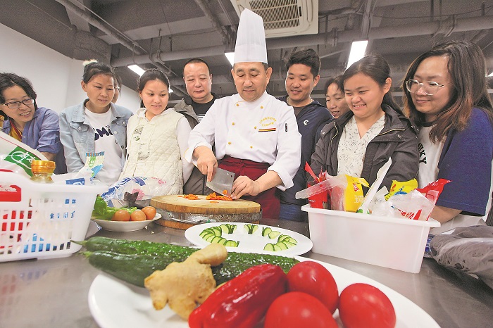 5月13日,在江苏省徐州市工人文化宫,专业老师给学员传授中式烹调技能。