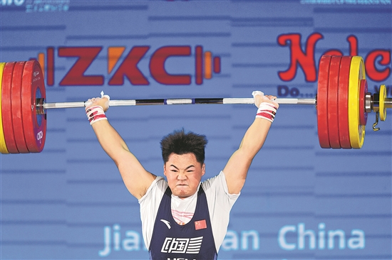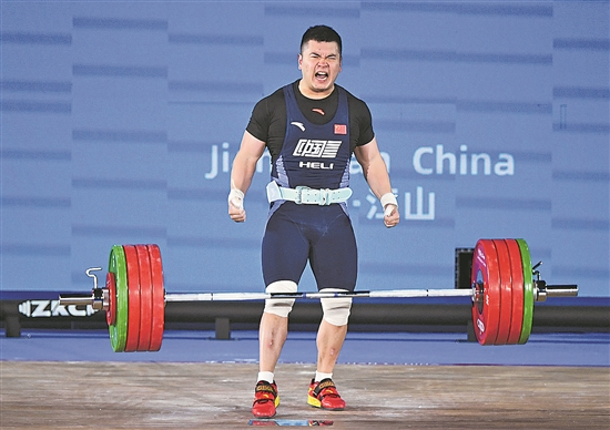 5月12日,在男子81公斤级比赛中,中国选手罗崇阳获得抓举、总成绩两项冠军和挺举亚军。图为罗崇阳在比赛中庆祝试举成功。新华社记者 侯昭康 摄