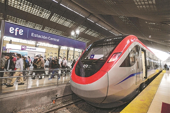 在智利圣地亚哥中央车站,中车四方研制的电力内燃双动力动车组等待发车。新华社发(豪尔赫·比列加斯 摄)