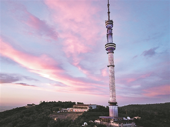 这是在哈萨克斯坦阿拉木图拍摄的科克托别山和科克托别电视塔(无人机照片)。