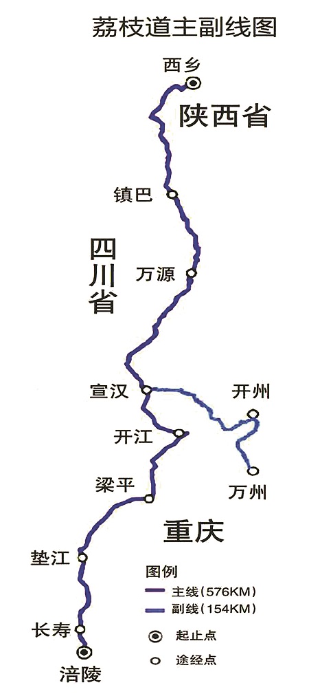 考古调查显示:荔枝道主线从重庆涪陵出发,经长寿、垫江、梁平,进入四川的开江、宣汉,经万源,最后抵达陕西的西乡。副线则是经水路,沿长江途经丰都、石柱抵达万州,再经开州、达州,最后同样抵达陕西西乡。