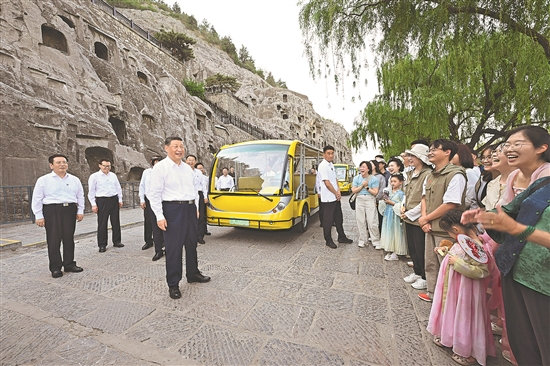 已有1500多年历史的龙门石窟,是重要的世界文化遗产。习近平来到这里,察看石窟整体布局风貌和代表性窟龛、造像,同现场的文物保护工作者亲切交流。他强调,要把这些中华文化瑰宝保护好、传承好、传播好。游客们见到总书记,都十分欣喜,纷纷向总书记问好。习近平不时同大家交流,特别鼓励小朋友们多到实地寻溯中华文化,从小树立文化自信。他指出,文旅融合前景广阔,要推动文旅产业高质量发展,真正打造成为支柱产业、民生产业、幸福产业。