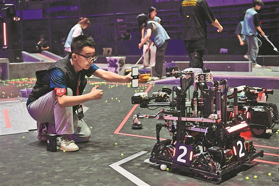 5月21日,合肥工业大学苍穹战队队员在比赛间隙调试机器人。