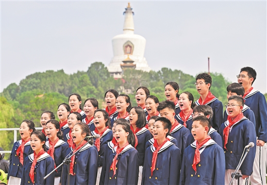 当日,第三届“让我们荡起双桨”首都少年儿童庆祝“六一”国际儿童节主题活动在北京北海公园举办。来自北京市10支少年合唱团的少先队员们在白塔下放歌,庆祝即将到来的儿童节。活动现场还举办了小学生科技社团展示、红领巾志愿者宣讲等活动,展现新时代少年儿童精神风貌。活动由北京青少年服务中心主办。新华社记者 陈钟昊 摄