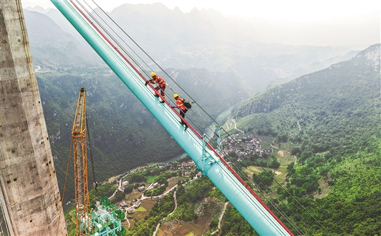 花江峡谷大桥是贵州六安高速公路的控制性工程,全长2890米、桥面距水面高625米,预计今年下半年建成。大桥建成后,将成为世界第一高桥,擦亮中国基建新名片。