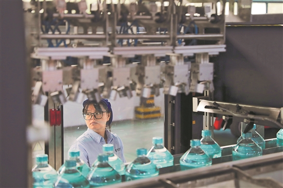 6月7日,工作人员在江苏丰海新能源淡化海水发展有限公司的灌装车间对灌装纯净水进行质检。