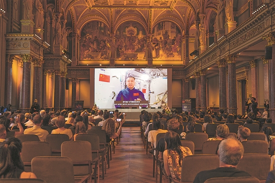 由中国载人航天工程办公室、中国驻匈牙利大使馆和匈牙利科学院共同举办的大型天地对话科普活动“天宫课堂”近日在匈牙利首都布达佩斯举行,中匈双方代表近300人参加。图为人们在匈牙利布达佩斯的匈牙利科学院参加“天宫课堂”。新华社记者 陈浩 摄