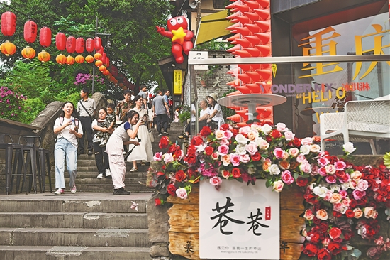 6月8日,游客在重庆市渝中区山城巷游览、拍照。近年来,重庆充分发挥山城夜景、滨江岸线、后街支巷、楼宇天台等特色优势,创造特色消费新空间,并不断丰富消费业态、提升消费体验,有效激活市场潜力。