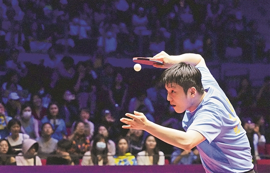 上海地产集团队选手樊振东在比赛中发球。他在单打比赛中3比0战胜山东鲁能队选手闫安。新华社记者 落飞麟 摄
