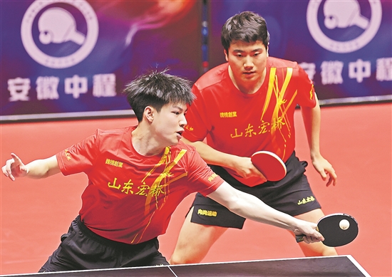 山东魏桥·向尚运动队组合梁靖崑(右)/黄友政在双打比赛中。他们3比1战胜安徽中程队组合宁贤坤/陶育畅。新华社记者 杨世尧 摄