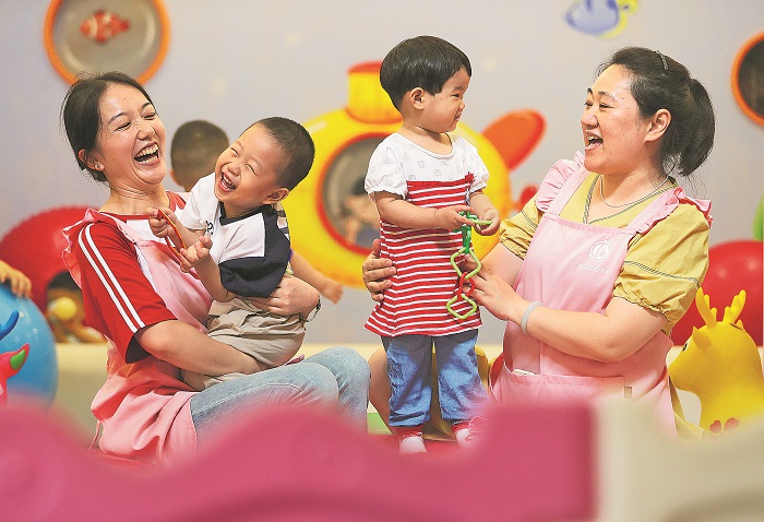 6月10日,湖北省荆门市东宝区泉口街道浏河社区托育服务中心内,保育员正带领孩子们进行趣味游戏。今年以来,荆门市东宝区精准对接当地妇女的需求,通过“企业+社区”联动机制,量身定制教育、纺织、电商等多个领域的“妈妈岗”,为她们提供弹性工作、就近就业机会。