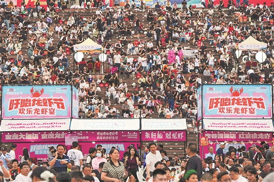 当日,第25届盱眙龙虾节欢乐龙虾宴在江苏省淮安市盱眙县龙虾节广场举行。为期三天的龙虾宴预计消费100吨小龙虾。目前,盱眙县有21万人从事小龙虾产业,小龙虾养殖面积98.5万亩。新华社记者 李博 摄