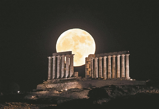 这是当地时间6月11日在希腊首都雅典附近苏尼翁角拍摄的波塞冬神庙上空的满月。