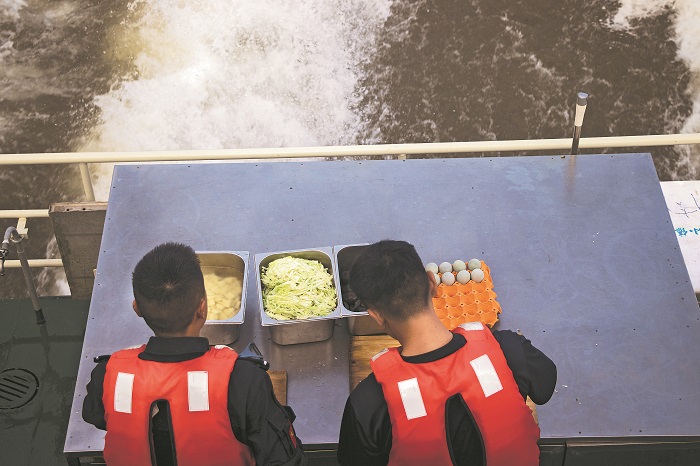 2024年12月24日,湄公河,中方执法艇的民警在准备晚餐。