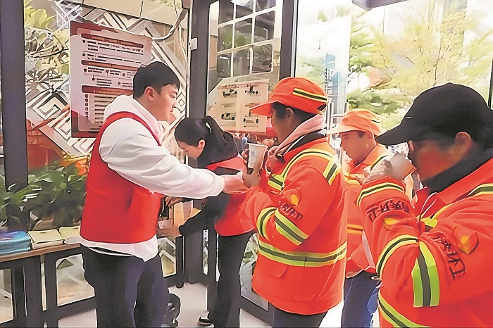 2024年2月,在工会驿站里,工会志愿者为前来休息的户外劳动者送上姜糖水。