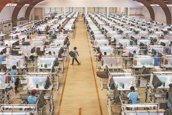 图为在马达加斯加塔那那利佛,工人在内蒙古鹿王羊绒有限公司马达加斯加工厂横机手编车间内工作。新华社记者 李亚辉 摄