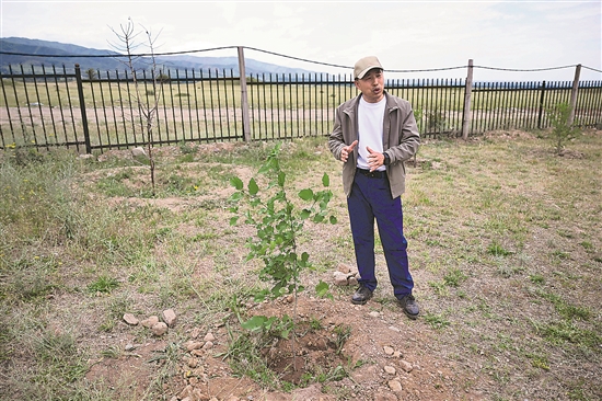 近日,在哈萨克斯坦伊塞克国家历史文化博物馆附近,陕西省考古研究院研究员、赴哈萨克斯坦考古队现场负责人丁岩介绍中哈联合考古队一起种下的山楂树。新华社记者 李任滋 摄