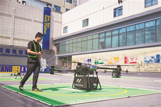 6月16日,在汉商低空港停机坪,一名工作人员给无人机装配货物。