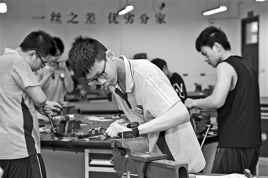 6月13日,在浙江省东阳市职业教育中心学校东技校区,学生正在参加“钳工技术”技能比武赛项。当日,为充分展示教学成果和学生风采,该校举行了第27届技能比武暨展示活动,涵盖30余个赛项,既检验学生日常技能训练水平,也考验他们的心理素质,并发现教学中的不足。本报通讯员 胡扬辉 摄