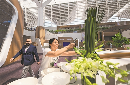 6月22日,工作人员在国家会展中心(天津)内的2025夏季达沃斯论坛新领军者村修剪装饰花束。