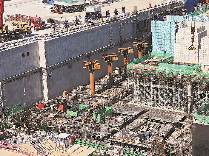 6月21日,在雄安新区启动区雄安城际站及国贸中心片区建设现场,工人们正在紧张施工中。