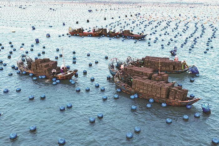 6月21日,在福州市连江县下宫镇松芦湾海域,渔民在养殖区采收鲍鱼。连江县素有“中国鲍鱼之乡”的美誉,眼下连江县松芦湾海域1.2万亩鲍鱼养殖区的5亿粒鲍鱼正陆续上市,新鲜肥美的夏鲍将销往全国各大市场。本报通讯员 王旺旺 摄
