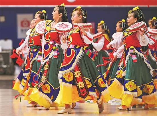6月23日,在重庆市南岸区江南体育馆内,鸡冠石镇代表队表演节目。当日,2025“幸福南岸”重庆市南岸区第十九届广场舞展演举行,吸引众多群众参加。
