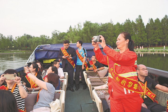 为了让劳模更好地了解朝阳、感受朝阳,体验朝阳新地标——亮马河风情国际水岸的景观文化和都市风貌,6月23日开始,北京市朝阳区总工会分批组织2025年全国及北京市劳动模范、先进工作者游览亮马河。图为6月23日第一批劳模乘“朝阳劳模号”游船观光。
