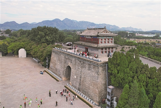 游客在河北省秦皇岛市山海关区天下第一关游览(无人机照片)。山海关中国长城博物馆近日正式面向公众开放,为长城文化再添一座重量级新地标。连日来,众多游客走进山海关中国长城博物馆,触摸“长城砖”,品读“长城韵”,感悟“长城魂”。新华社记者 杨世尧 摄