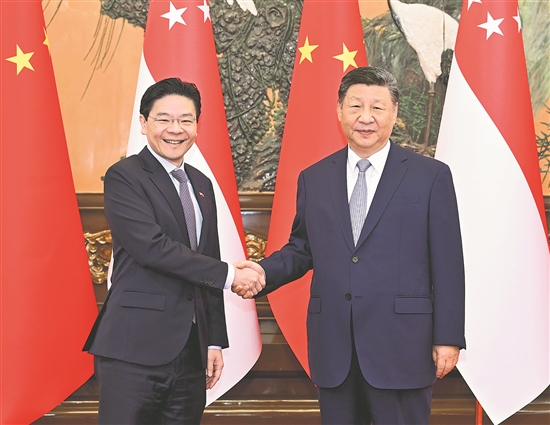 习近平强调,中新要牢牢把握两国友好大方向,始终从战略高度和长远角度看待和发展中新关系,确保航向不偏、动力不减。要筑牢中新友好政治基础,支持彼此核心利益和重大关切,以更高水平政治互信服务两国关系发展。中方欢迎新方继续深度融入中国发展,双方要深入推进共建“一带一路”合作,打造数字经济、绿色发展、人工智能等领域标志性成果,推动重大项目提质升级,续写高质量合作新篇章。要鼓励两国人民常来常往,深化人文交流合作,让中新友好更加深入人心。中方始终认为,和平、发展、合作、共赢的时代潮流不可阻挡,世界不能重拾霸权主义,不能被拖回丛林法则。中方愿同新方一道,站在历史正确一边、站在公平正义一边,共同倡导平等有序的世界多极化、普惠包容的经济全球化,推动世界走向和平、安全、繁荣、进步的光明前景。